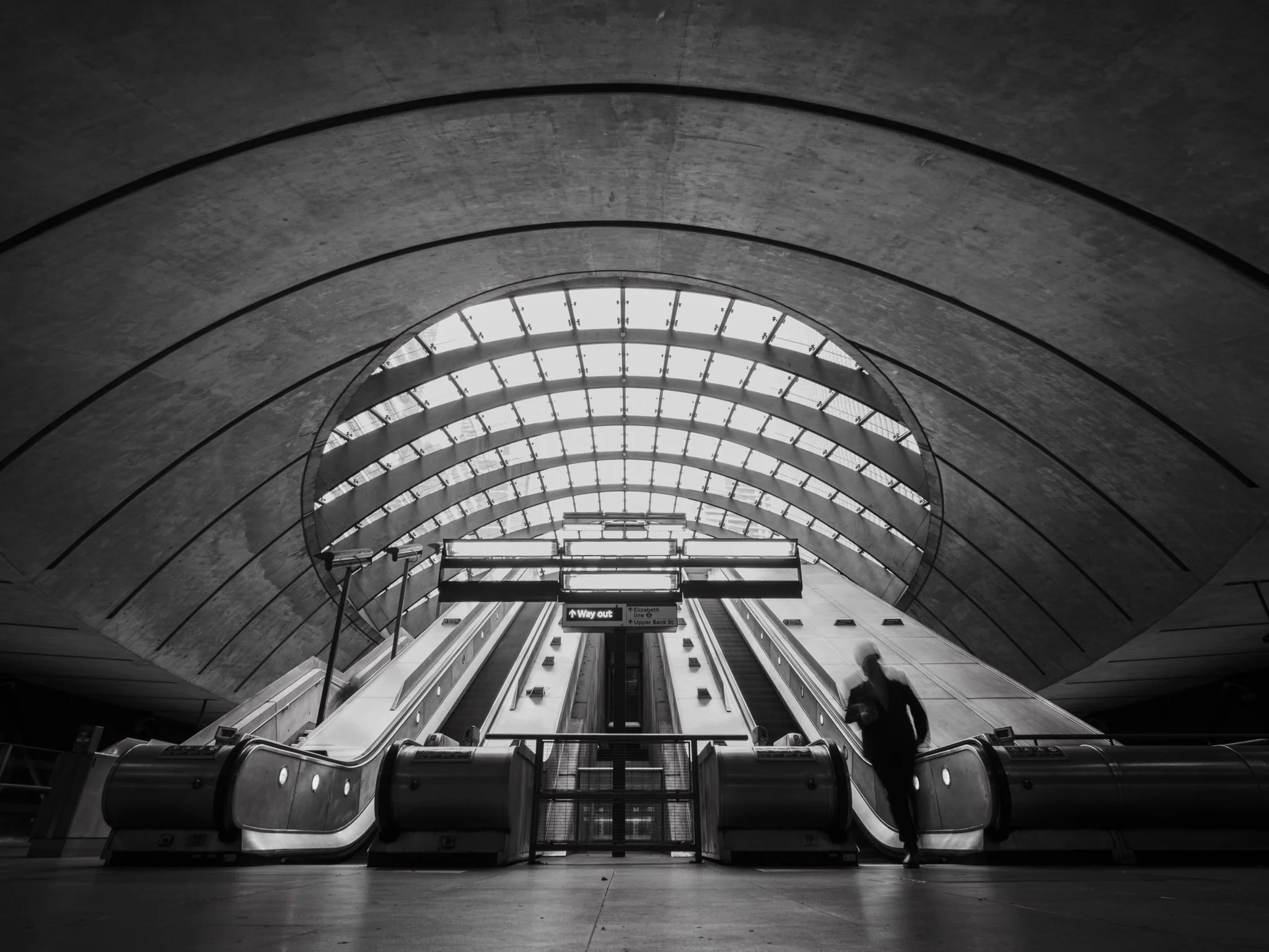 The day before I called out to my friends on social media to suggest stations which had interesting architectural features to act as a stage, and I received some fantastic ideas. The station at Canary Wharf was already on my shortlist, with its dramatic top-lit escalators descending into the gloomy depths, so this was where I started my day. Sure enough, the escalators at both ends of the station gave me plenty of opportunities to catch some movement among the commuters passing through.