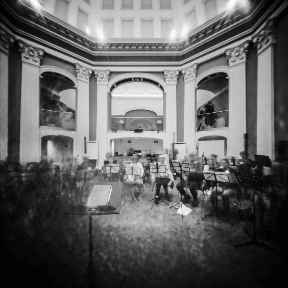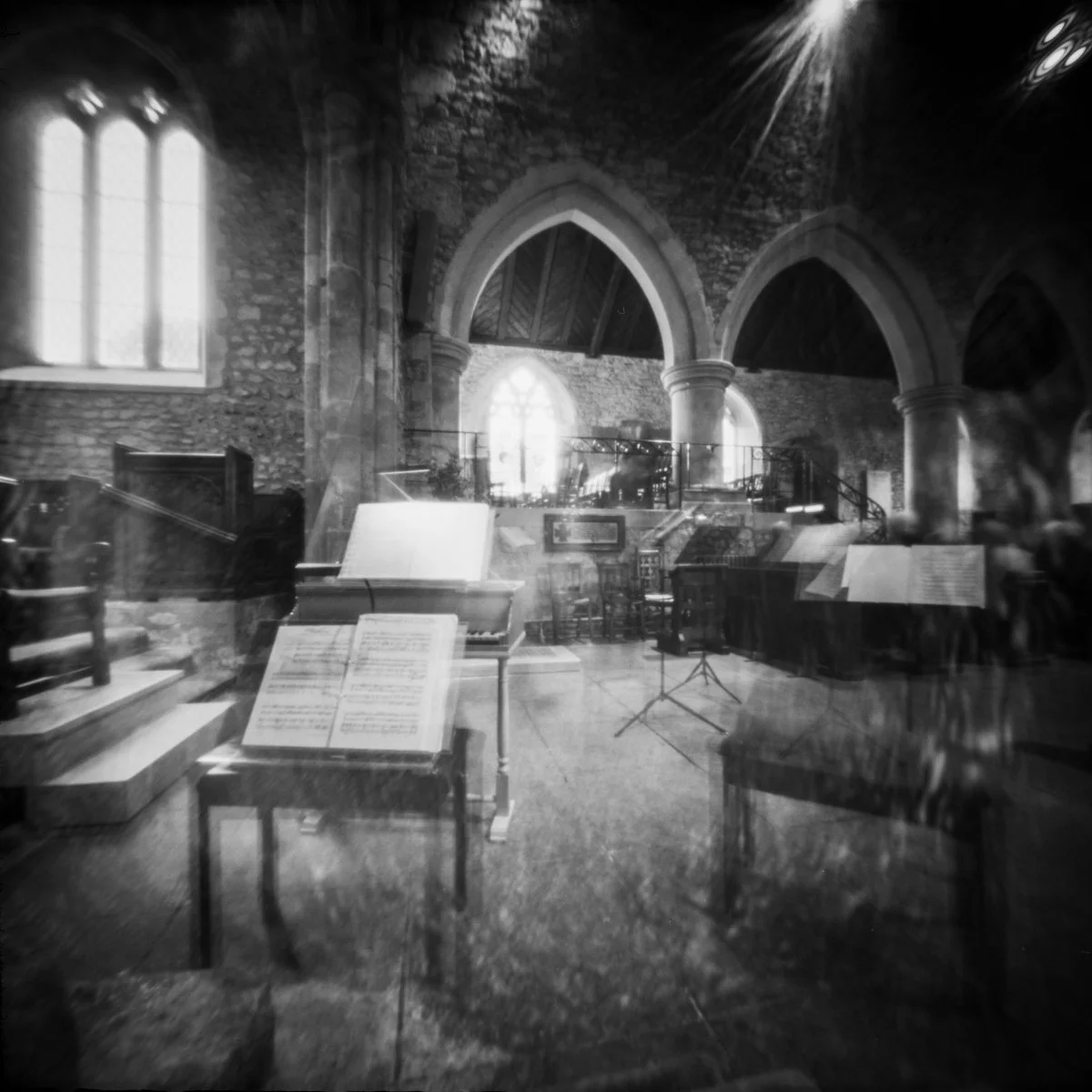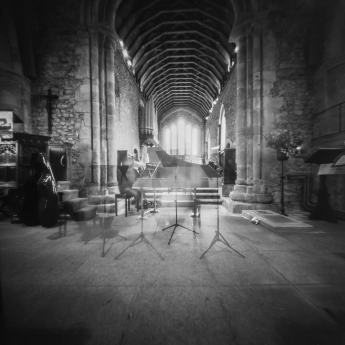 Last May I had a musical week, starting with a Parnassian Ensemble concert in Bosham Church, followed by a recorder course at Cannington Court in Somerset. I took my pinhole camera along for the ride, capturing the some of the scenes around me and I decided to use it to recorder some music making in action.