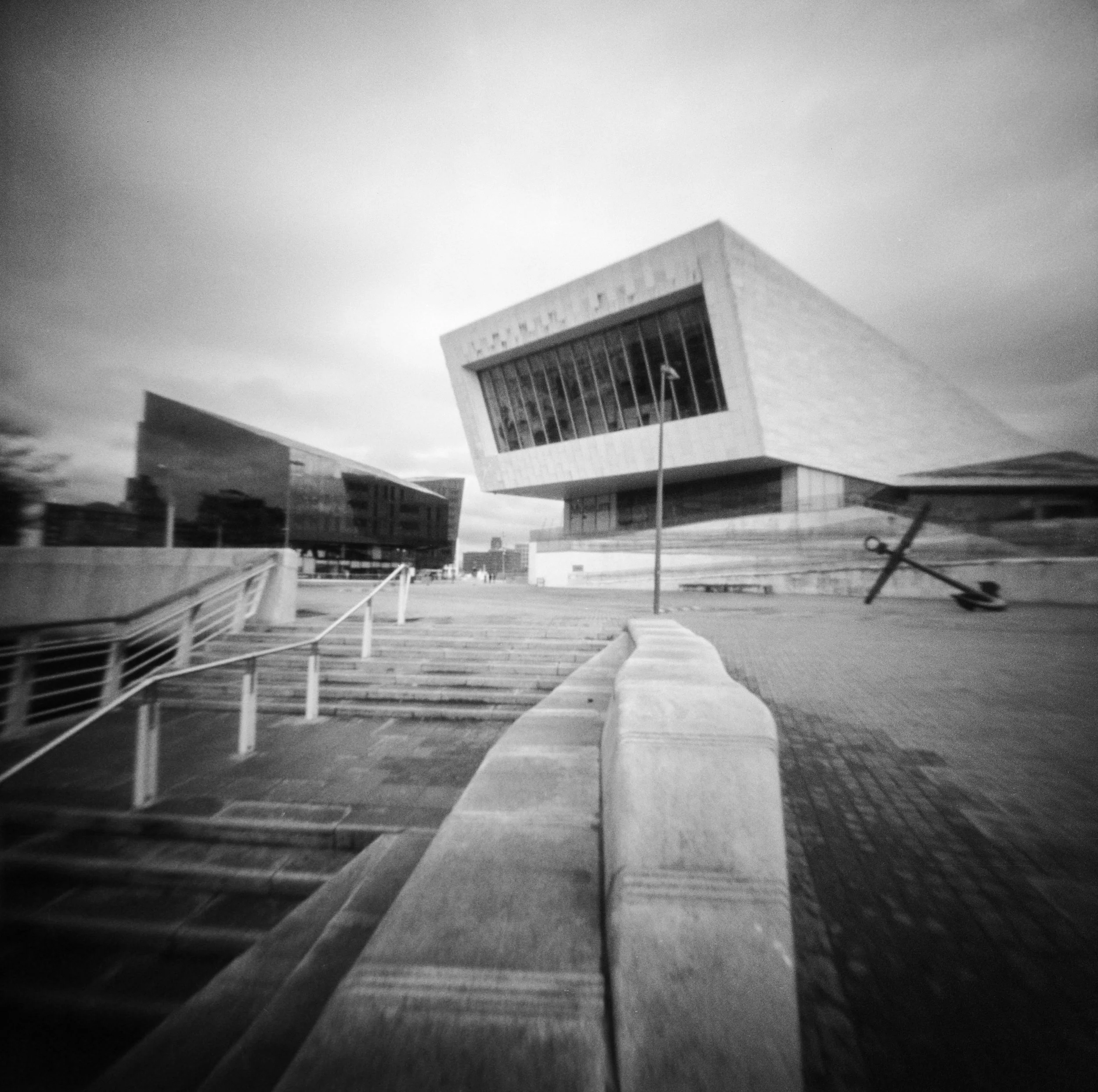 Inside the Museum I was immediately advised that I wasn’t permitted to use the tripod I was clutching as I was blown through the entrance by a strong gust of wind. Of course gat wasn’t going to stop me at least trying to take pinhole photos inside this eye catching building! Stealth tripod use in the face of security guards who say they’re banned is a challenge I enjoy, so first shot was taken in plain sight in the lobby downstairs, with my tripod kept low, between my knees, with the camera facing directly upwards. As a I suspected, no one noticed me and I was able to capture the concentric shapes of the roof light above me.