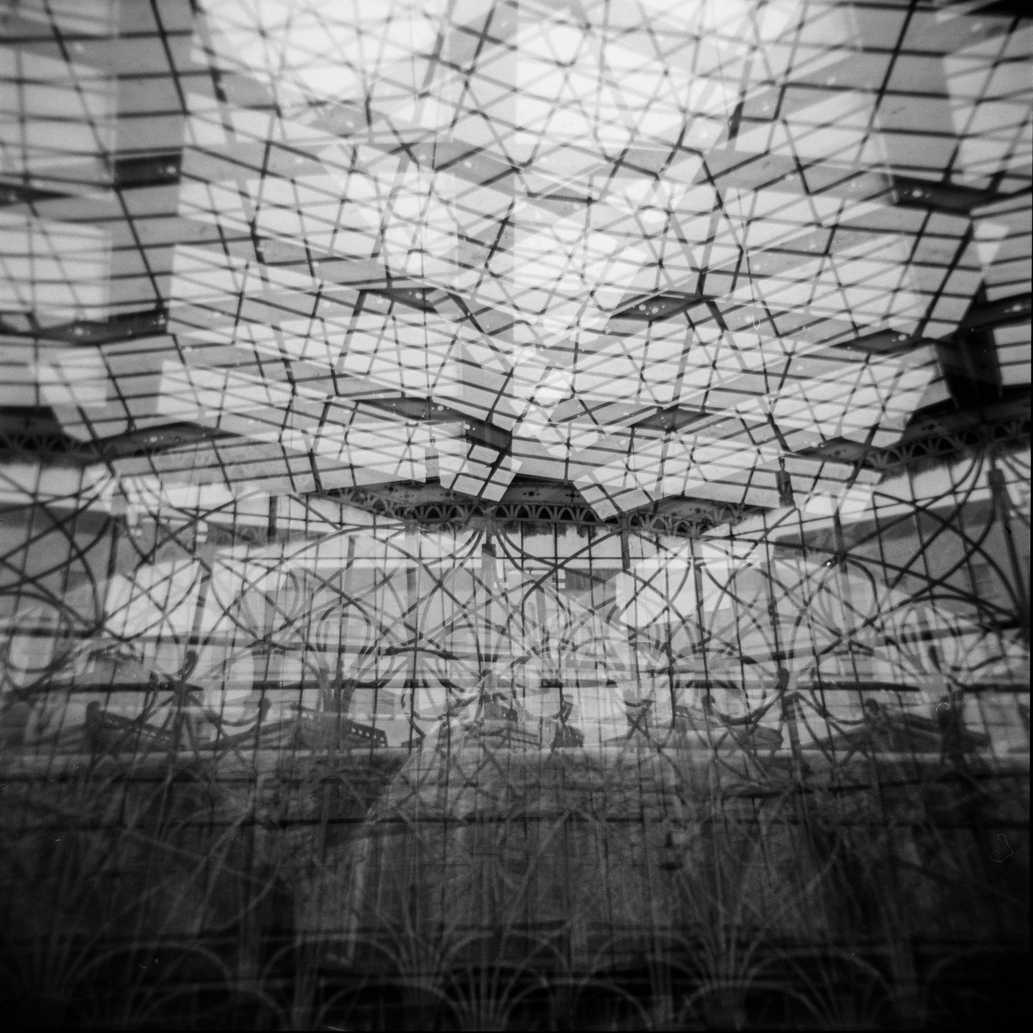 Holga photos have a recognisable look. If you get the focusing right the simple lens is remarkably sharp in the centre, but this clarity drops off at the edges, creating a dreamy effect. This simplicity makes you think about your compositions but it also brings the ability to make multiple exposures. During my wait at Paddington Station I had a play with this, creating multiple layers with the station’s architectural lines.