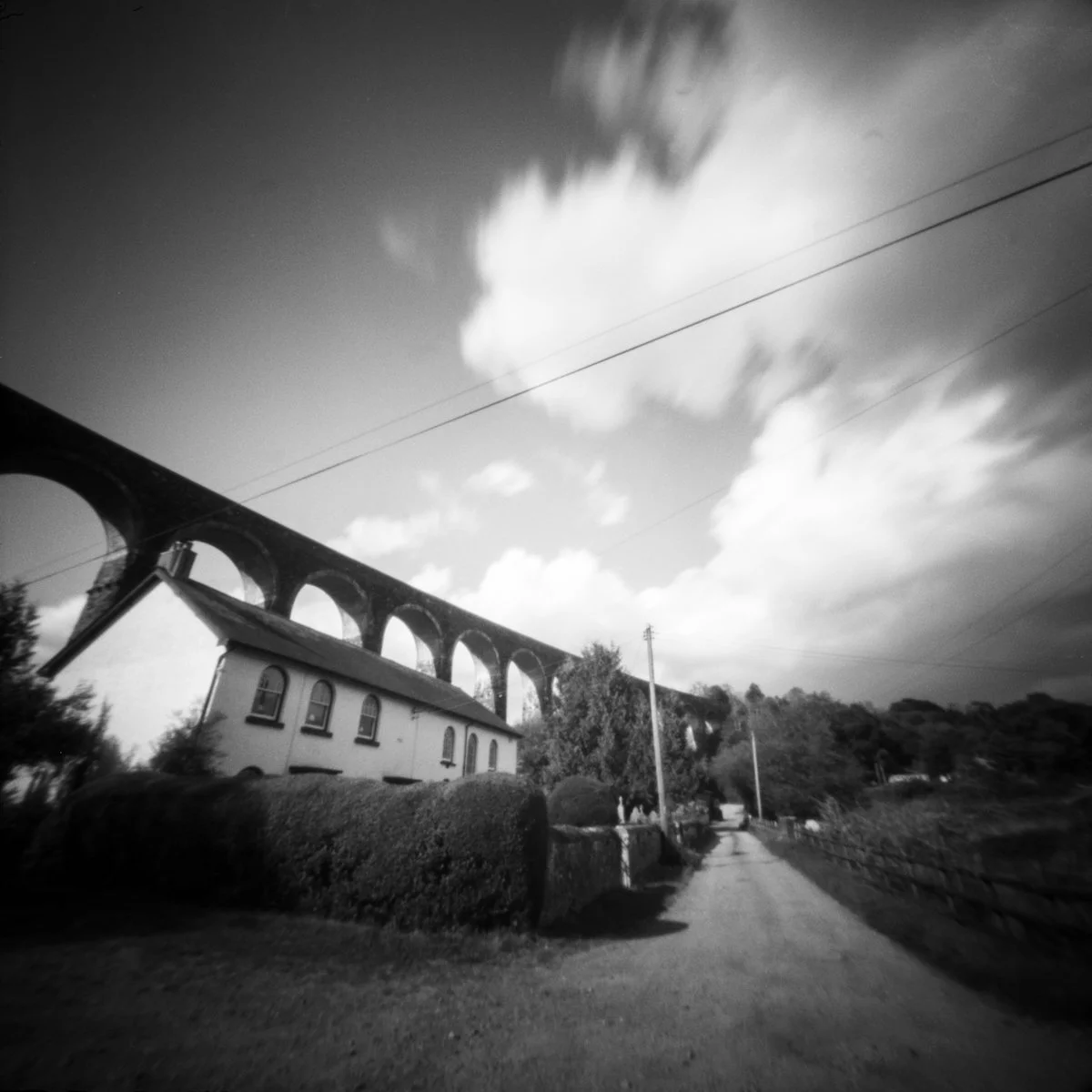 While I was away in Somerset recently I left my little Puck pinhole camera on the windowsill of my study, capturing life on our street over the course of six days. It uses photographic paper to capture the scene, so lots of light is needed. Fortunately, the sun came out from behind the clouds during my absence so, while people walking down the street are invisible, you can clearly see the path of the sun across the sky.